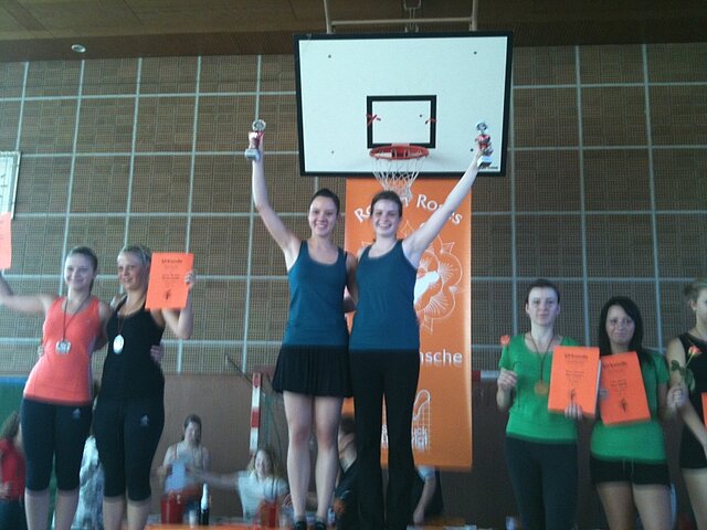 In der höheren Klasse - Junioren 2 - ging das Paar Alina Teetzen/Julia Schmolke mit neuen Elementen in der Kür an den Start. Hier wurden zwei Runden getanzt, wobei in der zweiten Runde dann auf eigene Musik getanzt werden konnte. Alina und Julia zeigt ihr volles Können und standen dann bei der Offenen Wertung bei den letzten drei Paaren noch auf der Tanzfläche. Ganz zuletzt wurden sie dann aufgerufen: Sie hatten den 1. Platz erreicht. Freudestrahlend nahmen sie den Pokal entgegen. Mit diesem ersten Platz eroberten sie auch wieder die Spitze der Gesamtwertung der Junioren 2.