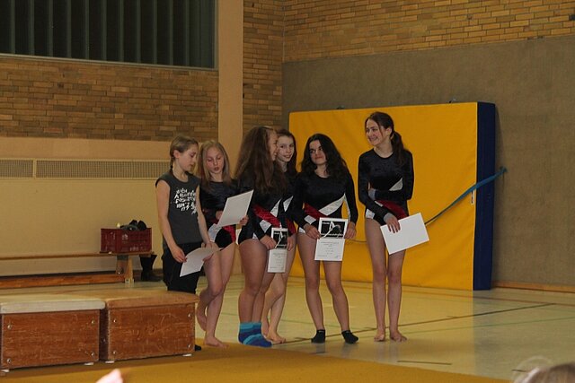 Mannschaft A, bestehend aus Leonie Wendt (2002), Maite-Nathalie Brückner (2001), Alina Wendt (1999), Sandra Brückner (1998), Franziska Küpper (1998) und Riina Bode (1998), wollte dieses Jahr auf jeden Fall ihren Kreismeister-Titel des Vorjahres wieder verteidigen. An den Geräten Stufenbarren, Schwebebalken, Boden und Sprung sollten sich im Verlauf des Nachmittages nun alle messen.