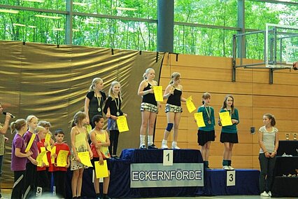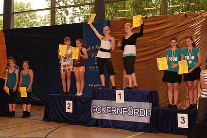 Die Junioren 1 waren mit acht gemeldeten Paaren besetzt. Schnell wurde klar, dass hier die drei Winser Paare dominierten. Zwar qualifizierten sich zunächst nur Kerstin/Shanice, doch Lisanne/ Vivien, sowie Katleen/Hanna zogen durch die Hoffnungsrunde mit in das Finale ein. Nun waren neben einem Eckernförder Paar ausschließlich Winser am Start. Kerstin/Shanice vertanzten sich leider und kamen nicht wie gewohnt wieder in ihre Kür hinein, dennoch zeigten sie Professionalität und blieben nicht stehen. Dadurch war die Freude über den hervorragenden 2. Platz umso größer. Auch Lisanne/Vivien durften aufs Treppchen und freuten sich über den 3. Platz. Katleen/Hanna freuten sich an ihrem ersten Wettkampf riesig über den erreichten 4. Platz.