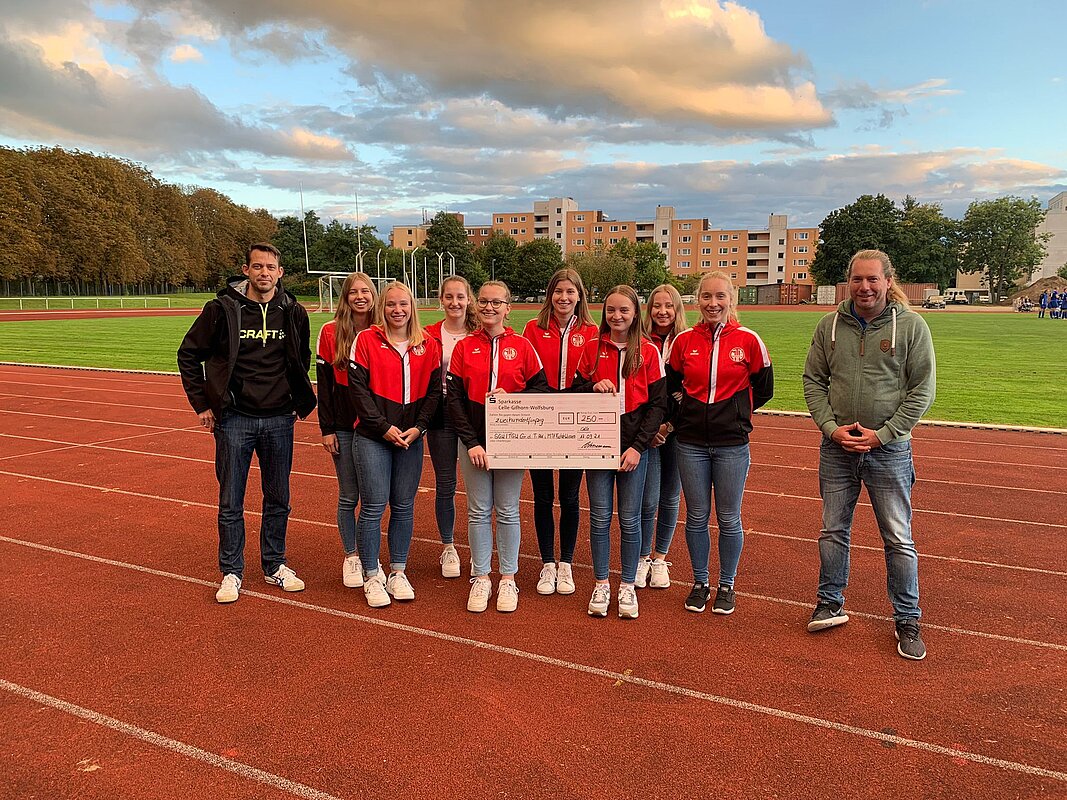 Während die schriftliche Begründung bei den letzten Sonnenstrahlen des Tages verlesen wurde, überreichte der mittlerweile ehemalige 1. Vorsitzende der Sportjugend Celle, Felix Hemme, den angereisten Mädchen einen Check im Wert von 250,00 €.