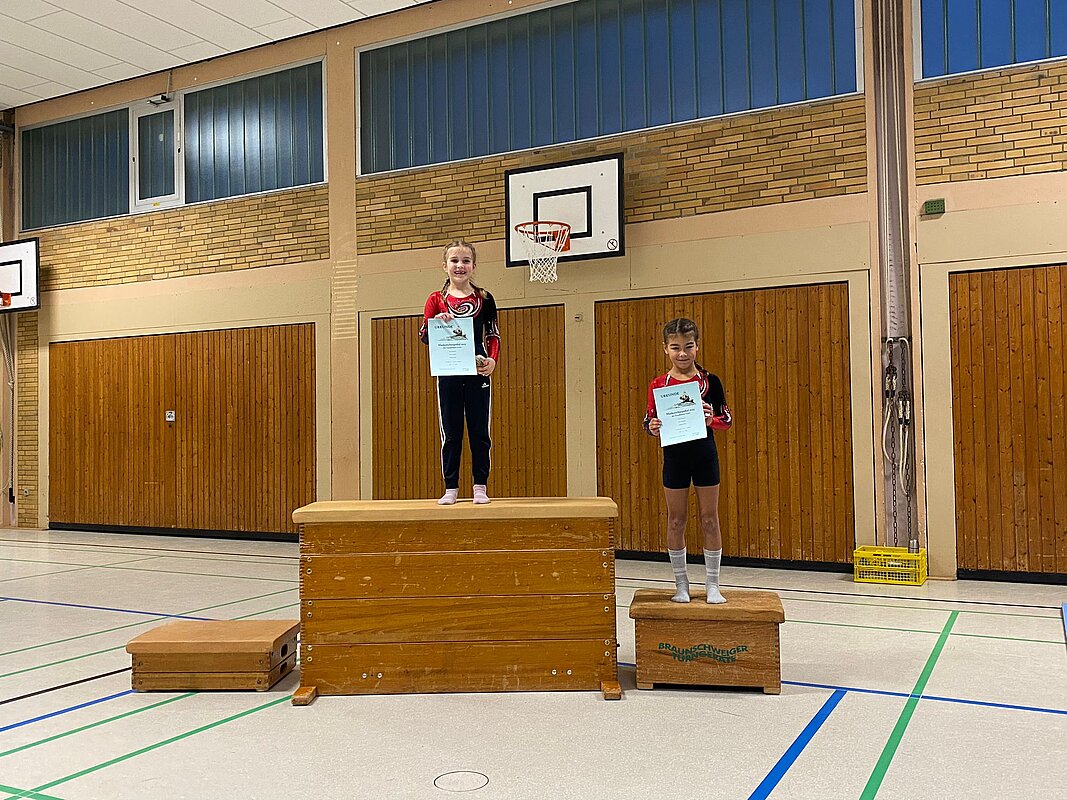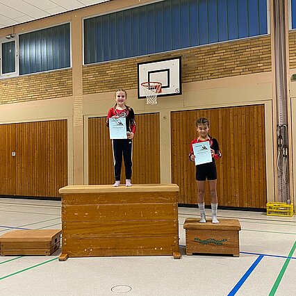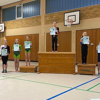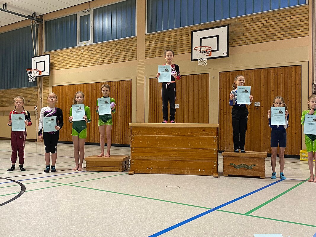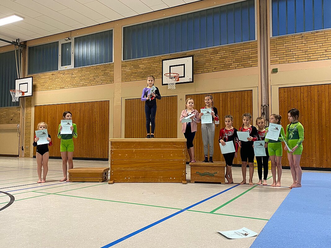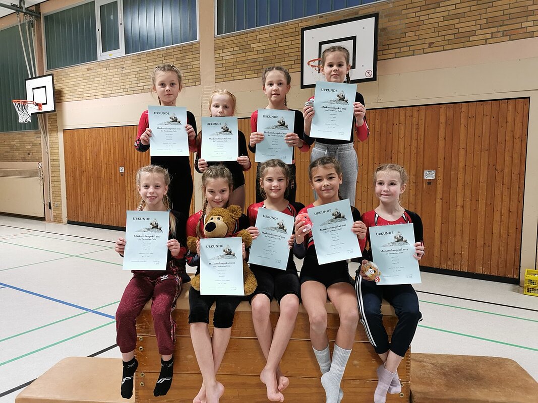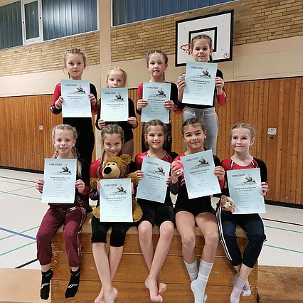 Nachdem die vier Gerätedurchläufe und die Auswertung der einzelnen Punktebewertungen überstanden waren, folgte umgehend die heißersehnte Siegerehrung: Die neun Turnerinnen, Theresa Machlep, Nele Werner, Lenja July Bienek, Elise und Annelie Wunderlich, Elisa Hämmerling, Carolin Friedrich, Enna Tybussek und Clara Albrecht, sicherten sich nicht nur Platzierungen in der Nähe des, sondern auch auf dem Treppchen und gaben damit insgesamt vier Maskottchen ein neues Zuhause. Herzlichen Glückwunsch!