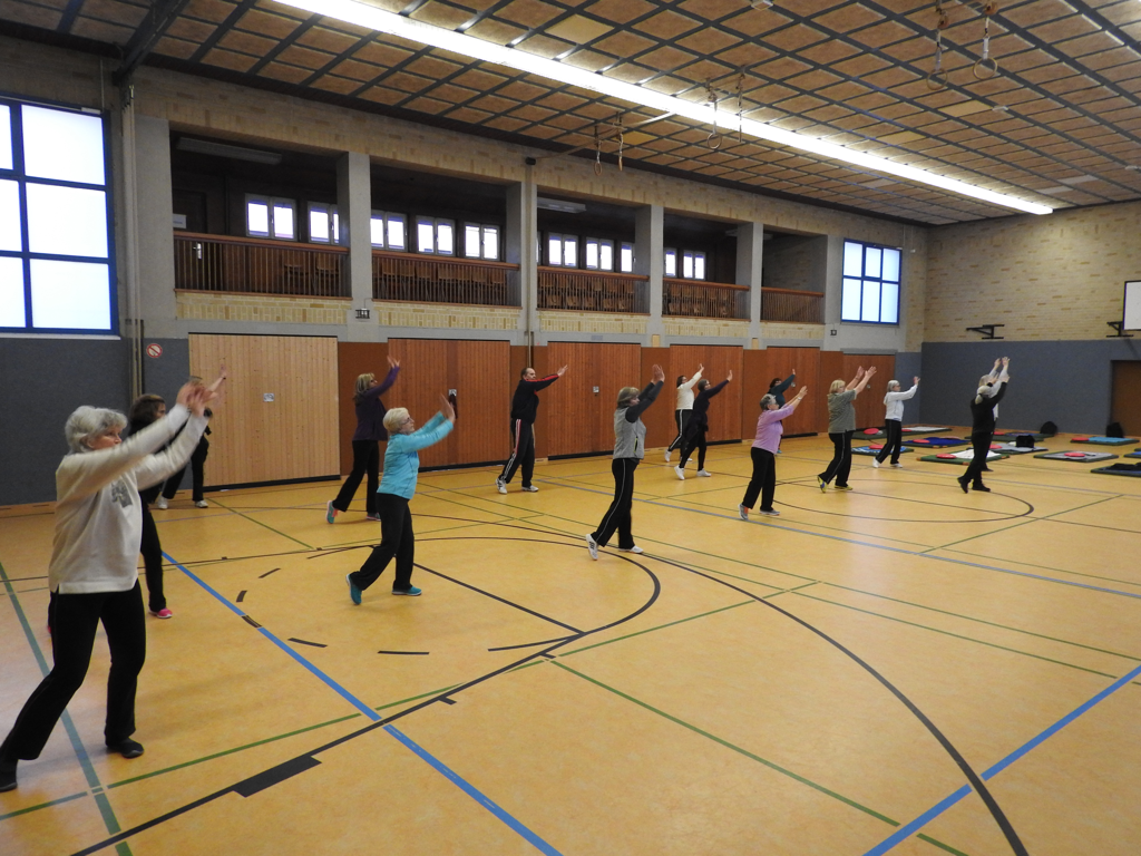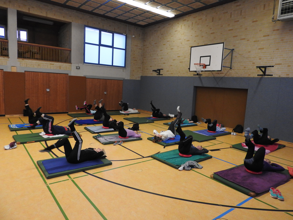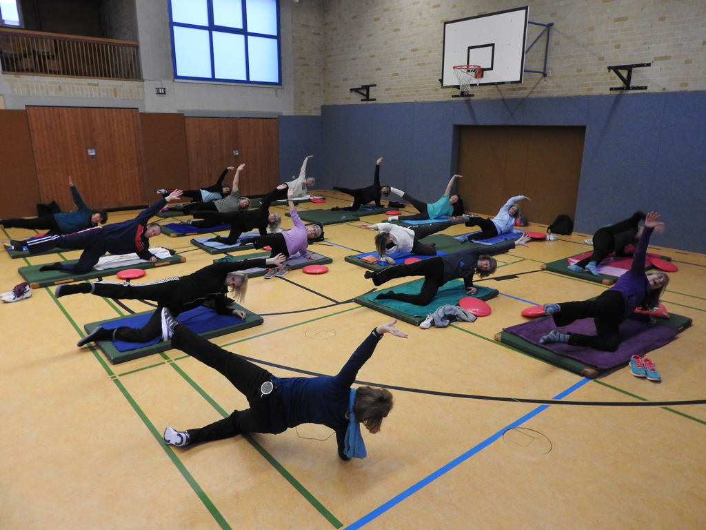 Im praktischen Teil werden Dehnungs-, Kräftigungs- und Entspannungsübungen ausgeführt.