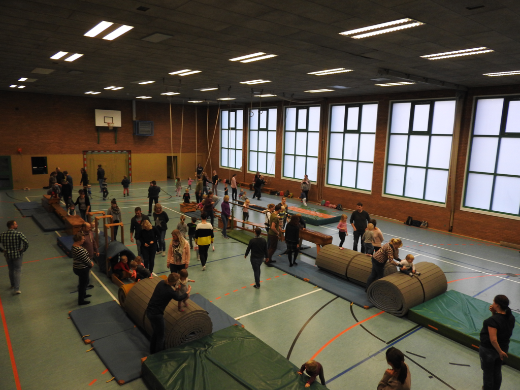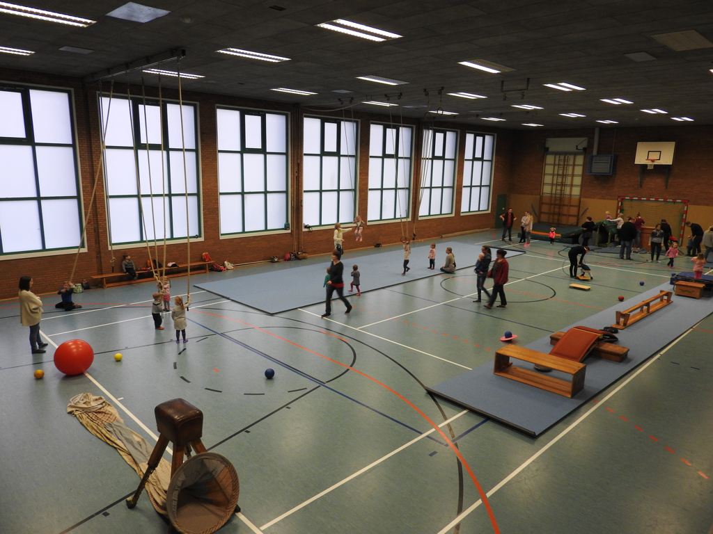 Danach werden die Gerätelandschaften unter Anleitung des Übungsleiters durch die Eltern oder Begleitpersonen aufgebaut. Hierbei werden unterschiedliche Schwierigkeitsgrade berücksichtigt, da die turnenden Kinder beim „Eltern-Kind-Turnen“ zwischen 1 und 4 Jahre alt sind.